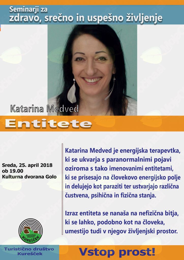 V sklopu seminarjev za zdravo, srečno in uspešno življenje, vabimo na predavanje Katarine Medved, energijske terapevtke, naslon njenega predavanja pa je "Entitete".