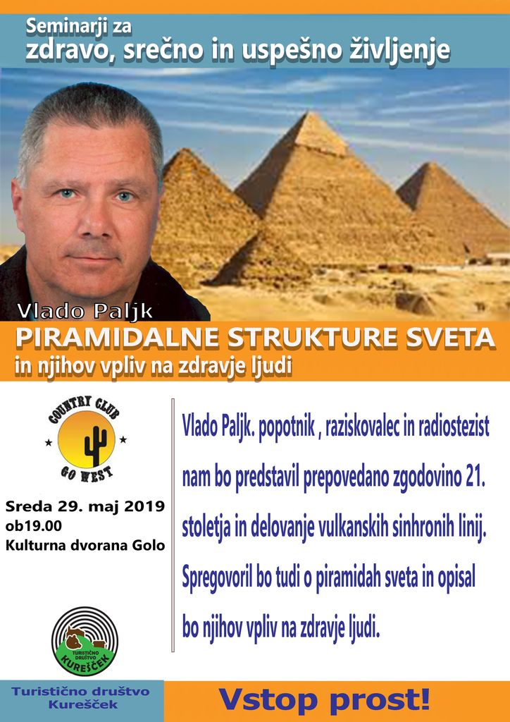 Na srečanju, ki bo v sredo 29.5.2019 ob 19.00, se bomo srečali še zadnjič v tej sezoni. Tokrat bo z nami Vlado Paljk, svetovni popotnik, zgodovinar, radiestezist in dober poznavalec skritega sveta piramid in njihovega vpliva na človeka.