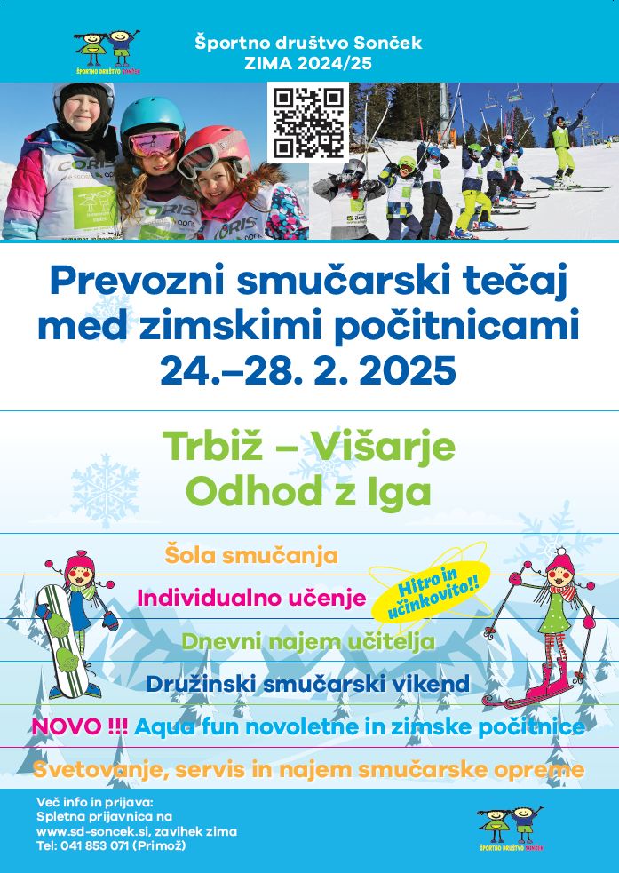 Športno društvo Sonček vabi v času zimskih počitnic na smučarske tečaje s prevozom. Destinacija: Trbiž – Višarje. Odhod iz Iga.