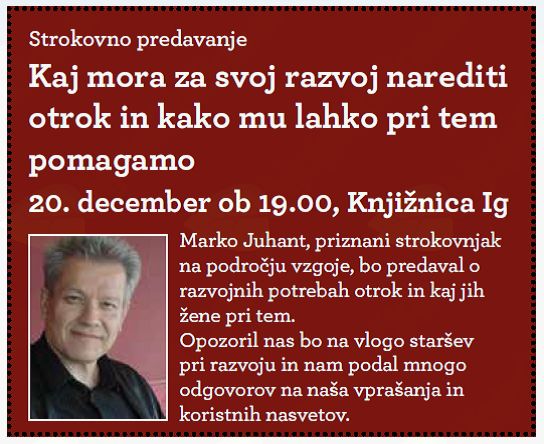Knjižnica Ig vabi na strokovno predavanje priznanega strokovnjaka s področja vzgoje Marka Juhanta. Predavanje nosi naslov: Kaj mora za svoj razvoj naredeti otrok in kako mu lahko pri tem pomagamo?