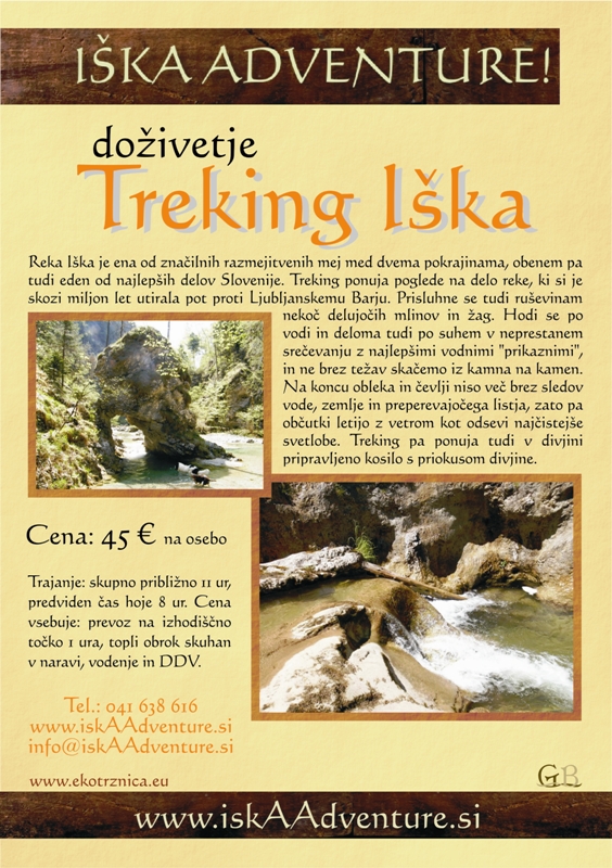 Odpeljali se bomo proti izviru Iške v idilično vasico Lužarji na robu Bloške planote. Predviden čas vožnje je 1h. Od tam se bomo napotili do izvira in nadaljevali večji del poti po sami reki, vse do konca našega trekinga. Prvi del je zelo močvirnat. Z vsakim kilometrom prehojene poti se bo vodotok večal, pokrajina pa bo dobivala obliko kanjona. Na naši poti si bomo ogledali delo Iške skozi miljon let, ki si je utirala pot proti Ljubljanskemu barju. Pridih vseh teh naravnih lepot, bodo dodali vsi njeni pritoki. Prisluhnili, pa bomo tudi ruševinam nekoč delujočih mlinov in žag. Nekje na polovici naše poti si bomo pripravili kosilo s priokusom divjine. Tam se bo možno tudi osvežiti in zaplavati v iškem tolmunu. Več v AKTUALNIH OBVESTILIH IskAAdventure.