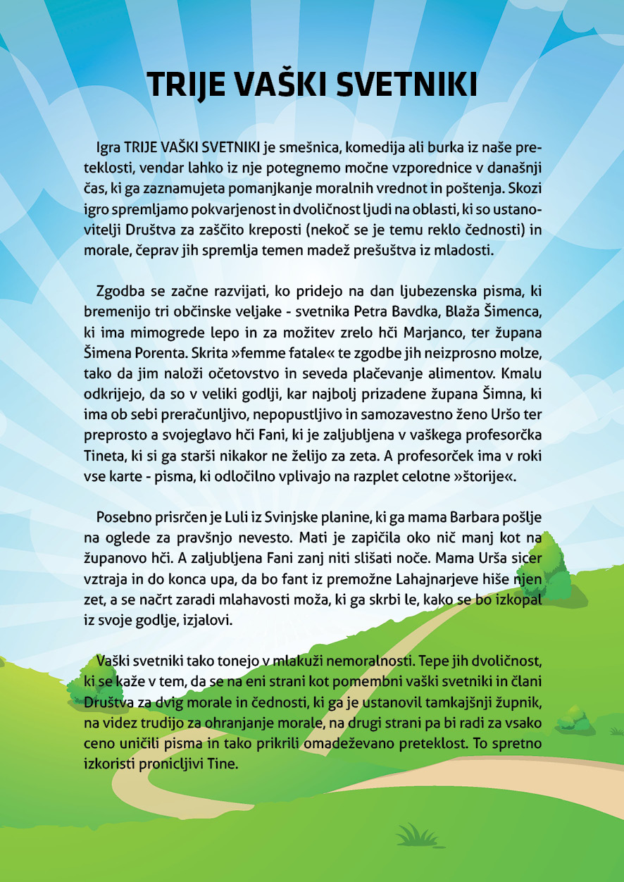 Gledališka skupina KD Mokrc vabi na ogled komedije z naslovom: Trije vaški svetniki, ki bo v nedeljo, 3. 2. 2019 ob 18. uri v dvorani družbenega doma v Šmarju-Sap.