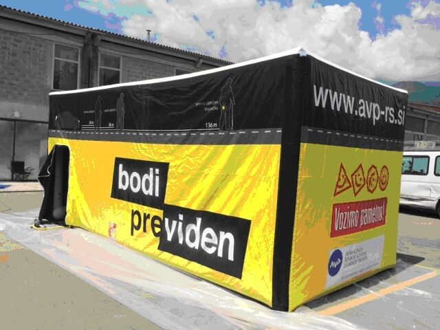 V napihljivem šotoru Vidko boste lahko doživeli izkušnjo hoje v temačnem okolju, spoznali razliko med pešci z in brez odsevnikov ter preverili, kako simulacijska očala pokažejo nevarnosti v prometu. Posebej zanimiv je tudi prikaz teže glave kolesarja.
