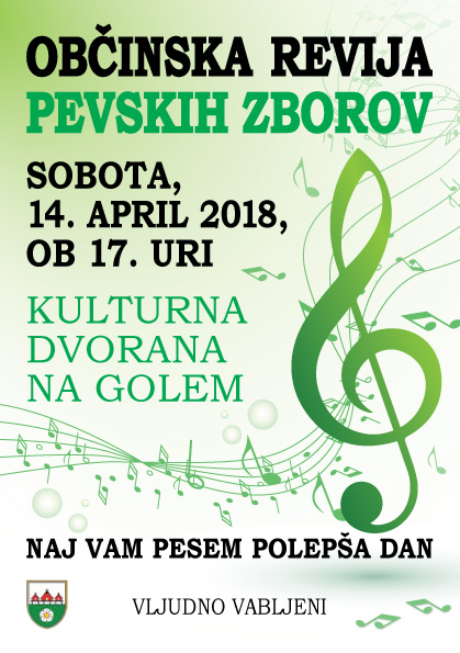 Občina Ig vabi, da prisluhnete pevskim zborom ki delujejo v občini. Letošnja občinska revija pevskih zborov bo v soboto, 14. aprila 2018, ob 17. uri v Kulturni dvorani na Golem.