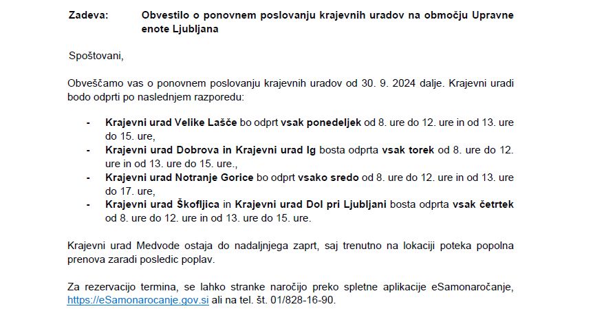Upravna enota Ljubljana obvešča, da Krajevni urad Ig, ki gostuje v pritličju Občine Ig, na Govekarjevi 6, z mesecem oktobrom, ponovno odpira svoja vrata.