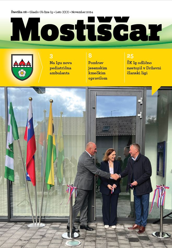 Izšla je predzadnja letošnja številka Mostiščarja, ki prinaša novice iz naše občine. V novicah iz Občinske hiše pišemo o tem, da je na Igu zaživela nova pediatrična ambulanta, ki pokriva območji Iga in Škofljice, da se gradi novo igrišče pri osnovni šoli Ig. Številne društvene novice pričajo o živahnem utripu v naši občini, zato vsekakor ne spreglejte napovednika Prazničnega decembra na Igu.