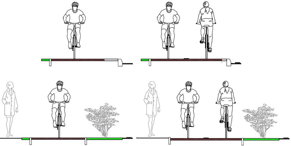 V prvem primeru težav in dilem ni. Na takšen način se kolesarski pasovi označujejo tam, kjer je vozišče dovolj široko, da v vsakdanjih okoliščinah omogoča normalno vožnjo in srečevanje vozil, ne da bi bilo potrebno zaradi tega zapeljati na kolesarski pas.