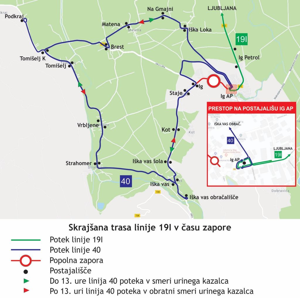 Občina Ig obvešča, da bo od petka, 2. 7. 2021, do predvidoma, 1. 8. 2021, popolna zapora ceste Banija od trgovine Mercator do uvoza za KIG d. d. Na omenjenem odseku bosta Občina Ig in Direkcija RS za infrastrukturo izvajali obnovo vodovoda in pločnika. Linija 19I bo zaradi popolne prometne zapore vozila skrajšano, le do postajališča Ig AP. S postajališča Ig AP bo vozila linija 40 na relaciji Ig, Iška Loka, Tomišelj, Strahomer, Iška vas in enako v obratni smeri. Več o voznih redih LPP je na voljo na njihovi spletni strani.