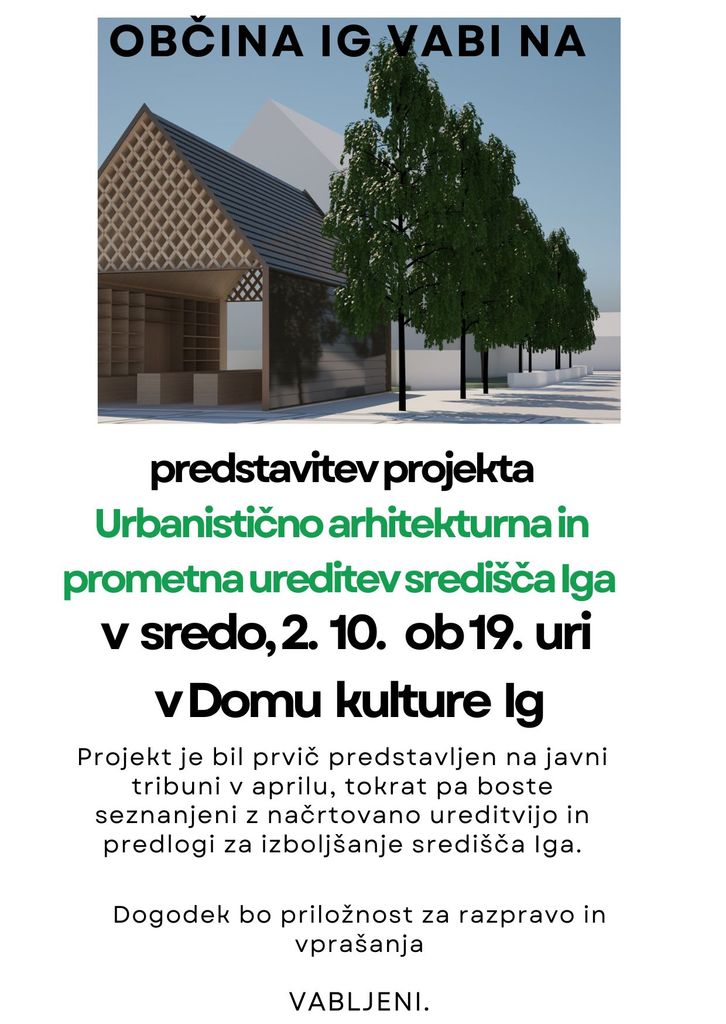 Občina Ig vas vabi na javno predstavitev projekta: Urbanistično arhitekturna in prometna ureditev središča Iga, ki bo v sredo, 2. oktobra 2024 ob 19. uri v Domu kulture Ig.