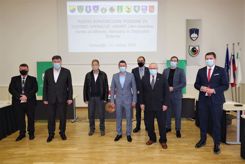 Župani občin Grosuplje dr. Peter Verlič, Ivančna Gorica Dušan Strnad, Škofljica Ivan Jordan, Ig Janez Cimperman, Podčetrtek Peter Misja, Kamnik Matej Slapar, Rogaška Slatina mag. Branko Kidrič, Vrhnika Daniel Cukjati, Makole Franc Majcen, Vodice Aco Franc Šuštar in Šentjur mag. Marko Diaci so v četrtek, 11. marca 2021, v Grosupljem podpisali konzorcijsko pogodbo za izvedbo operacije »SMART Life«.