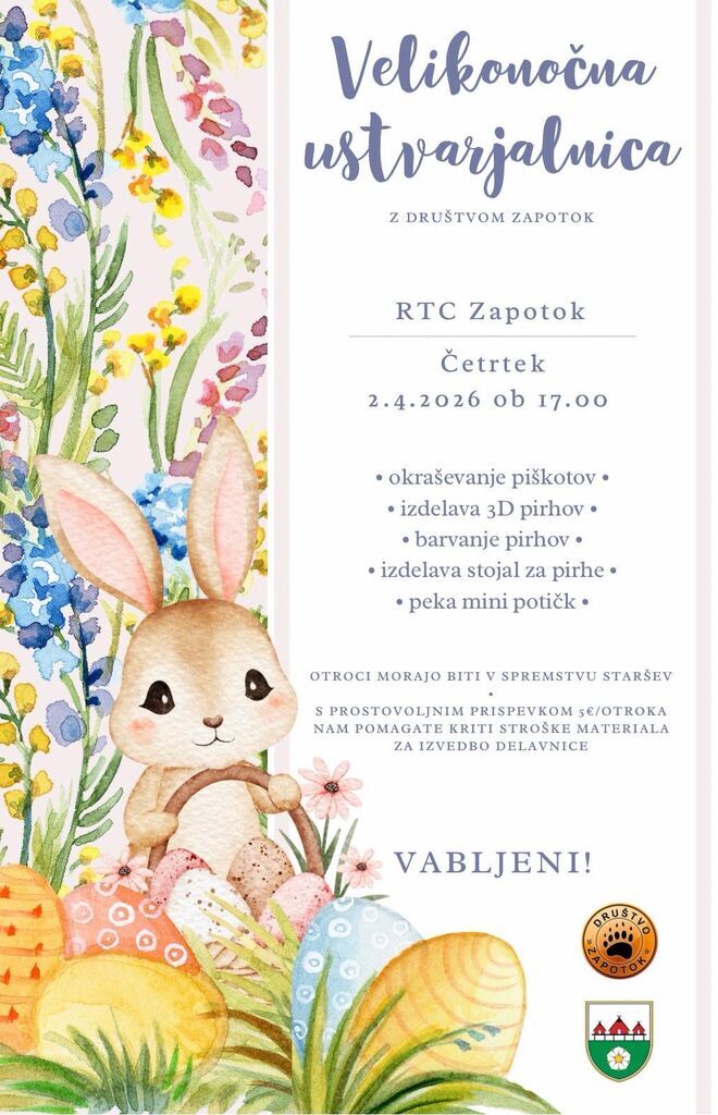 V tednu pred veliko nočjo, pa Društvo Zapotok v četrtek, 2. aprila, ob 17.00 vabi vse otroke v RTC Zapotok na Velikonočno ustvarjalnico. Otroci bodo lahko okraševali piškotke, izdelali 3D pirhe, barvali pirhe na različne načine, sestavljali in barvali stojala za pirhe in pekli mini potičke! Otroci morajo biti v spremstvu staršev.