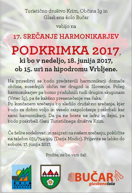 Turistično društvo „KRIM“ , Občina Ig in Glasbena šola Bučar V A B I J O na 17. SREČANJE HARMONIKARJEV „P O D K R I M K A 2017“ , ki bo v nedeljo, 18. junija 2017 s pričetkom ob 15.00 uri na hipodromu Vrbljene - Občina IG.