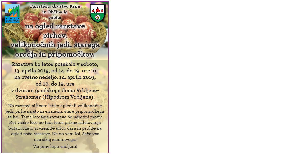 Turistično društvo Krim in Občina Ig vabita na ogled razstave pirhov, velikonočnih jedi, starega orodja in pripomočkov.