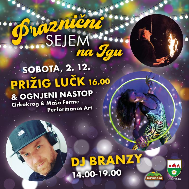 Praznični sejem na Igu se bo odvijal vsako soboto v decembru med 14. in 18. uro popoldan pred Morostigom. Začnemo v soboto, 2. decembra s prižigom lučk! V spremljevalnem programu bodo nastopili Cirkokrog in Maša Ferme Art Performance, za glasbo bo skrbel DJ Branzy.