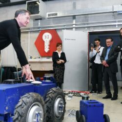 Podpredsednika vlade in ministra za finance Klemna Boštjančiča, ministra za kohezijo in regionalni razvoj dr. Aleksandra Jevška ter državnega sekretarja na Ministrstvu za gospodarstvo, turizem in šport Matevža Frangeža sta ob prihodu sprejela mag. Lilijana Madjar, direktorica RRA LUR, in dr. Jernej Pintar, direktor Tehnološkega parka Ljubljana. Gostje so si najprej ogledali mehatronični laboratorij, kjer je podjetje Ubiquity Robotics predstavilo multifunkcijskega samovozečega robota. Podjetje razvija napredne robotske rešitve za logistiko, industrijo in storitvene dejavnosti, ki omogočajo avtomatizacijo delovnih procesov, povečujejo učinkovitost ter izboljšujejo varnost pri delu v različnih operativnih okoljih.