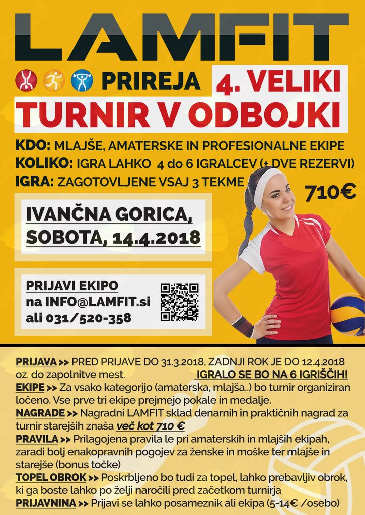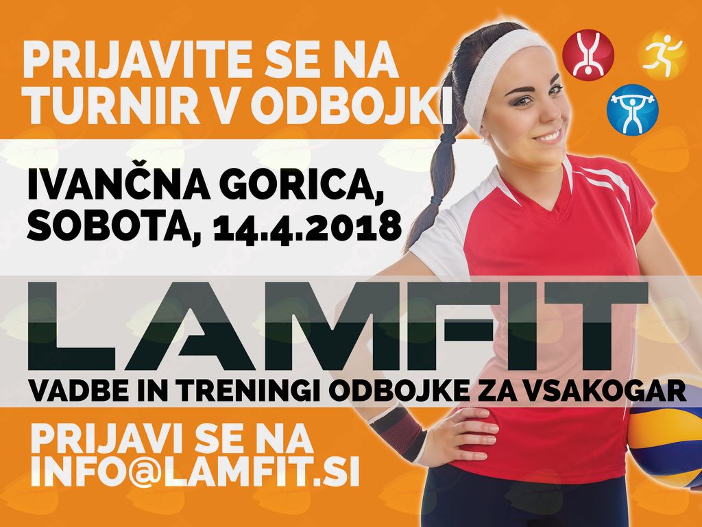 1. Organiziramo Lamfit turnir odbojke, ki bo potekal v soboto, 14.4.2018 od 14.00 do 19.30 v dvorani Srednje šole Josipa Jurčiča v Ivančni Gorici.