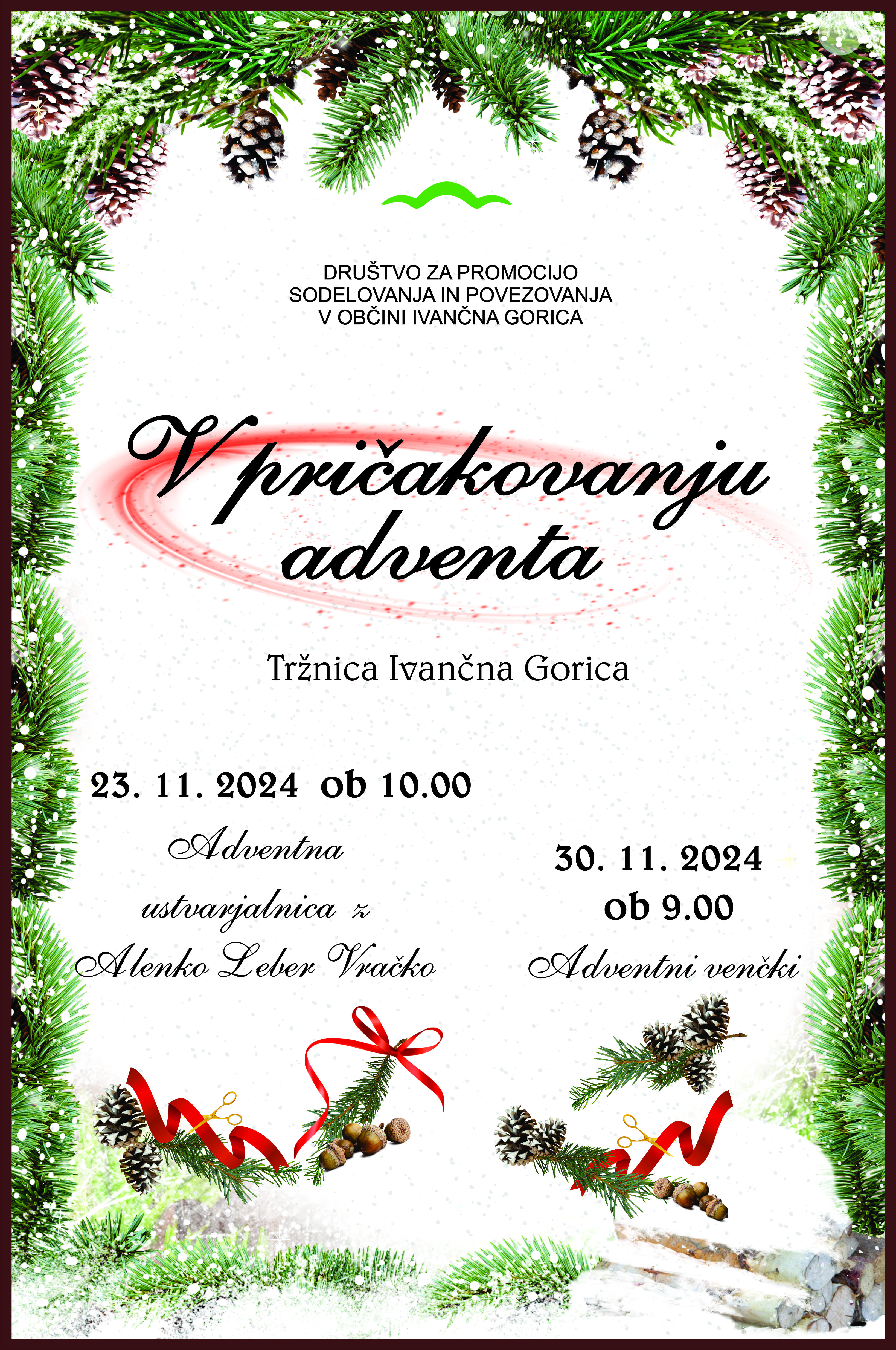 Bliža se čarobni december in adventni čas. Društvo za promocijo sodelovanja in povezovanja v občini Ivančna Gorica prireja in vabi na adventno ustvarjalnico z Alenko Leber Vračko. Predstavila nam bo zanimive ideje, kako izdelati venčke in božične okraske na nekoliko drugačen način.