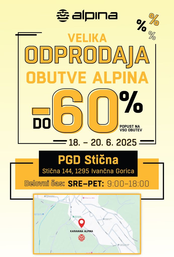 V PGD Stična bo od srede, 18. junija do sobote, 20. junija 2025, potekala velika odprodaja Alpinine obutve po znižanih cenah – popusti segajo vse do 60%!