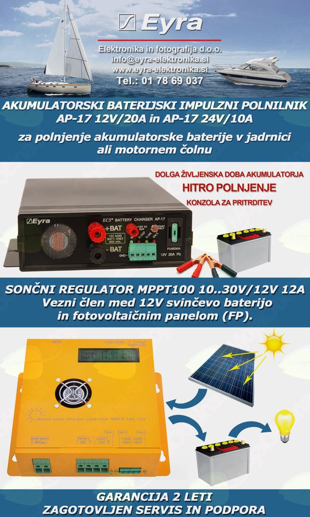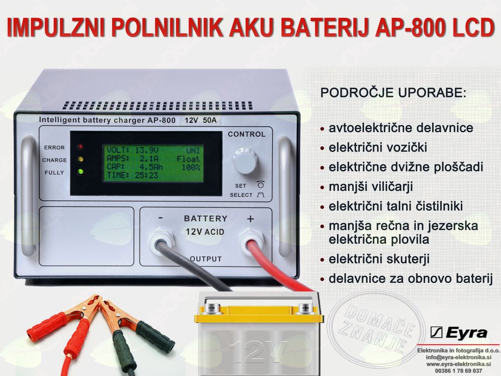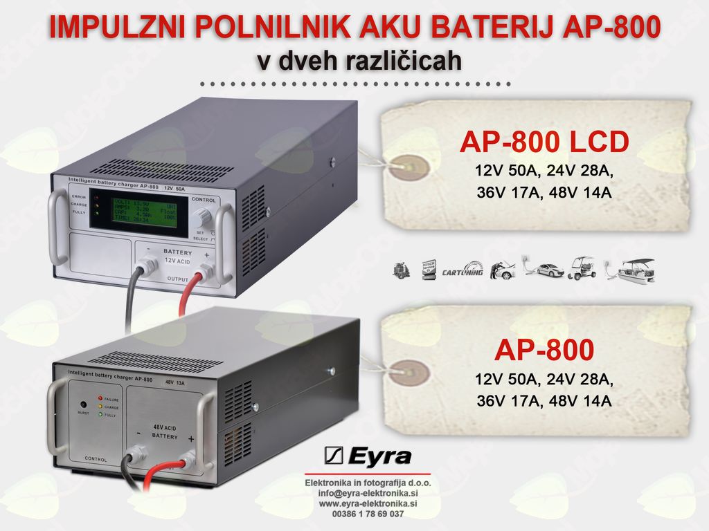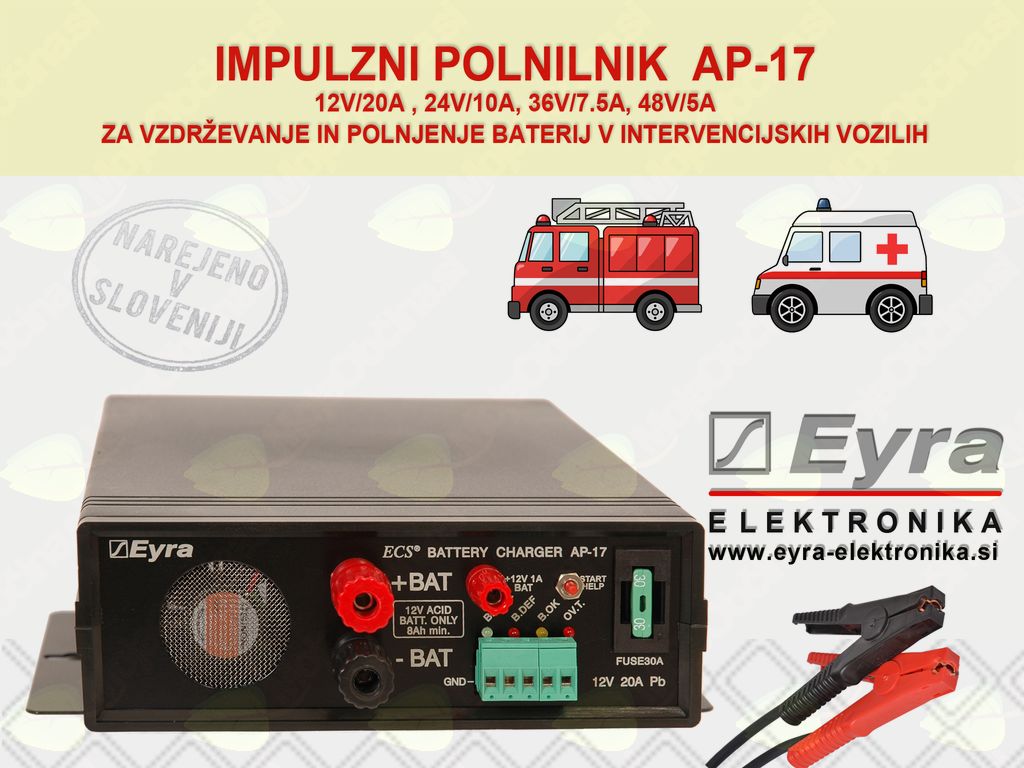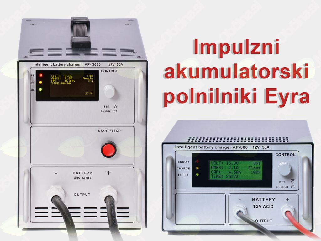 Imamo lasten razvoj in izdelavo impulznih akumulatorskih polnilnikov serije AP od 180W do 3000W. Uporabljajo se za polnjenje in vzdrževanje akumulatorskih baterij predvsem v navtiki in avtomobilizmu (avtodomi, intervencijska vozila)