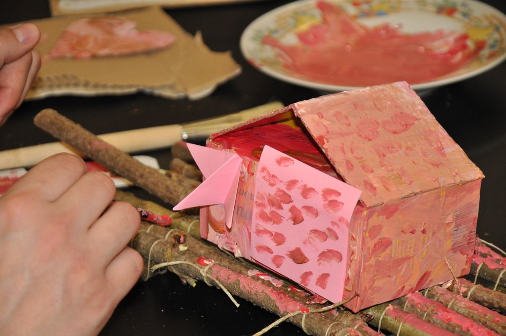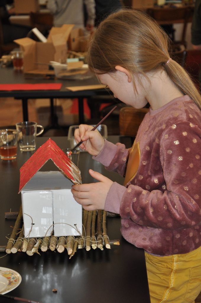 Fokus tokratne delavnice je bil na naravnih materialih, zato so otroke in starše pričakali kupčki palic in vrvi ter karton. S skupnimi močmi so izdelali splave in nanje dodali še čudovite, unikatne hiške ter papirnate ptičke. Čaj in bonboni so jim dajali dodatno energijo za nadaljevanje dela.