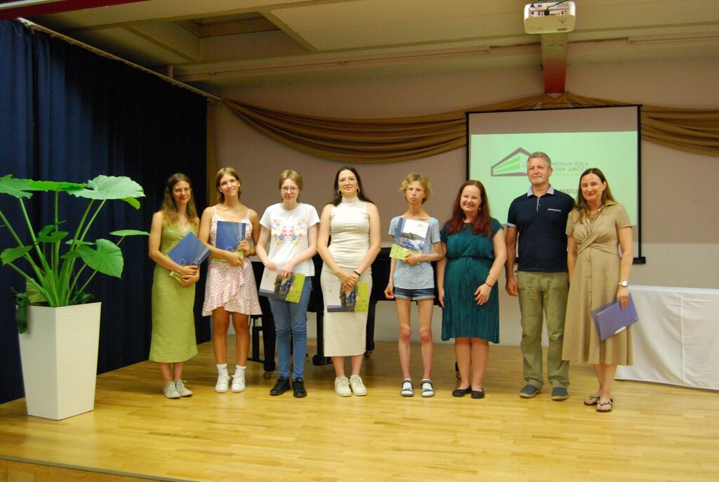 Sledila je slovesna podelitev spričeval, vsi dijaki pa so za spomin dobili tudi zgoraj omenjeno pesniško zbirko. Mojca Saje Kušar pa je skupaj z ravnateljico Ajdo Erjavec in predsednikom sveta šole Antonom Brčanom podelila še letošnja Jurčičeva priznanja in nagrade. Jurčičevo priznanje za odlične dosežke sta prejeli Neža Marinčič iz 4. a in Julija Genorio iz 4. b. Bronasto Jurčičevo nagrado je prejela Tjaša Pajek iz 4. a, srebrno Jurčičevo nagrado pa Alja Božič iz 4. b. Najvišjo šolsko nagrado – zlato Jurčičevo nagrado – pa sta prejeli zlata maturantka Ines Glavan in diamantna maturantka Zoja Peteh. Za konec sta nekaj besed zahvale spregovorili še maturantki Neža Marinčič in Alja Božič, srečanje in slovo od generacije 2023/24 pa smo zaključili v sproščenem pogovoru in ob nepogrešljivem sladoledu.