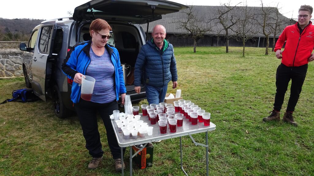 In krenili smo na pot. Dolga vrsta se je vila iz Doba proti Vrhu. Prvo prijetno presenečenje je bilo kmalu po startu. Domačija pri Radljevih na Rdečem kalu je nas pogostila z dobrotami iz njihove kmetije. Sledil je vzpon na 554 m visok hrib po imenu Vrh. Tu so nas člani Kulturno športnega društva Dob pričakali z okrepčilom, okusno ocvirkovko, kuhančkom in čajem. Pot smo nadaljevali mimo luž pri Kremenjaku do vasi Orlaka. Ogledali smo si vaško lužo in krenili do vasi Arčelca.