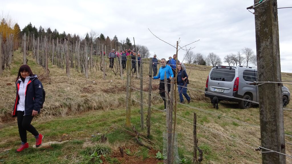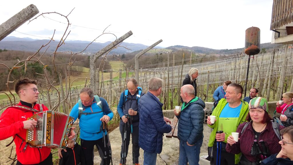 Pri cerkvi v Arčelci je bil še posebej lep in sladek sprejem, saj sta nas pričakala dva najmlajša pohodnika z sladkimi bomboni. Sledila je pogostitev, tudi za žejne je bilo poskrbljeno. Po travnikih in gozdovih nas je vodila pot do vinske gorice Brinova gora po domače Brinovke. Cilj je bil med vinogradi v zidanici pri Lovretovih iz vasi Reber, kjer so nas sprejeli ob zvokih harmonike ter nas bogato pogostili. Seveda pa v zidanici brez pokušine vin ne gre. Gostitelj Štefan je to nalogo opravil z odliko.