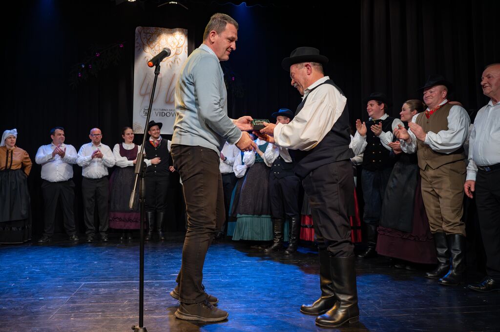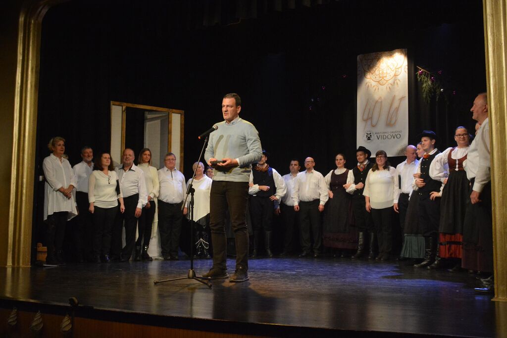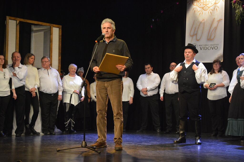 Zbrane goste in obiskovalce je uvodoma nagovoril predsednik KD Vidovo Franjo Čuček, ki je v nagovoru orisal 40-letno delovanje društva. Kultura v Šentvidu ima dolgo in bogato tradicijo. Začetki delovanje šentviškega moškega in ženskega pevskega zbora segajo v čas pred več kot petdeset leti, ko se je v kraju začel t.i. kulturni teden in Tabor slovenskih pevskih zborov. Na ustanovnem občnem zboru 11. marca 1983 je bilo ustanovljeno Pevsko društvo Šentvid pri Stični. Ko so se z leti zboroma pridružile tudi druge sekcije v društvu, se je društvo leta 2004 preimenovalo v Kulturno društvo Vidovo Šentvid pri Stični. Danes člani obeh pevskih zborov, štirih folklornih skupin in gledališke skupine uspešno nastopajo tako v domačem kraju kot širom po Sloveniji in v tujini. Skoraj ne mine leto, da se ne udeležijo katerega od festivalov v tujini. Društvo je bilo več let soorganizator mednarodnega folklornega festivala Slofolk in organizator festivala Šentfolk, vse od začetka so tudi nepogrešljivi pri organizaciji Tabora slovenskih pevskih zborov, bili so pobudniki srečanja pevskih zborov Šentvidov in drugih kulturnih dogodkov. Kot je še povedal predsednik Čuček je društvo v letih 1993 do 2020 upravljalo s kulturnim domom v Šentvidu. V tem času je bilo veliko truda vloženega tudi v obnovo in vzdrževanje doma, s pomočjo občine in krajevne skupnosti, z lastnimi sredstvi in prostovoljnimi urami. Izjemno zahtevno pa je bilo proučevanje domačih narodnih noš in nakup narodnih noš večih slovenskih pokrajin.