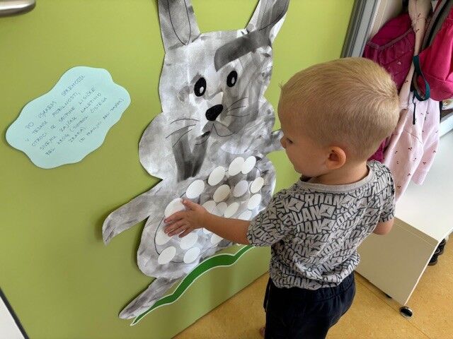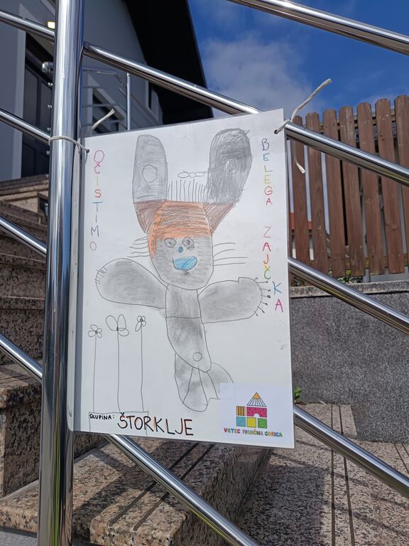 V tednu mobilnosti smo otrokom približale varovanje okolja v okviru teme »Aktivno v vrtec z Belim zajčkom.« Skupaj z otroki smo označili »zajčkovo pot«, po kateri so otroci (skupaj s starši) imeli možnost v vrtec in domov vsaj del poti prehoditi peš. Aktivne prihode in odhode smo beležili s spreminjanjem sivega zajčka v belega. Otroci so skozi ves teden imeli na izbiro pestre didaktične igre na temo Promet, izbirali so igralnice, kjer so se preizkušali v različnih prometnih izzivih. Pripevali smo si avtorsko pesem Beli zajček in zaigrali na male ritmične inštrumente. Vreme nam je dopuščalo vsakodnevne aktivne sprehode v okolico.