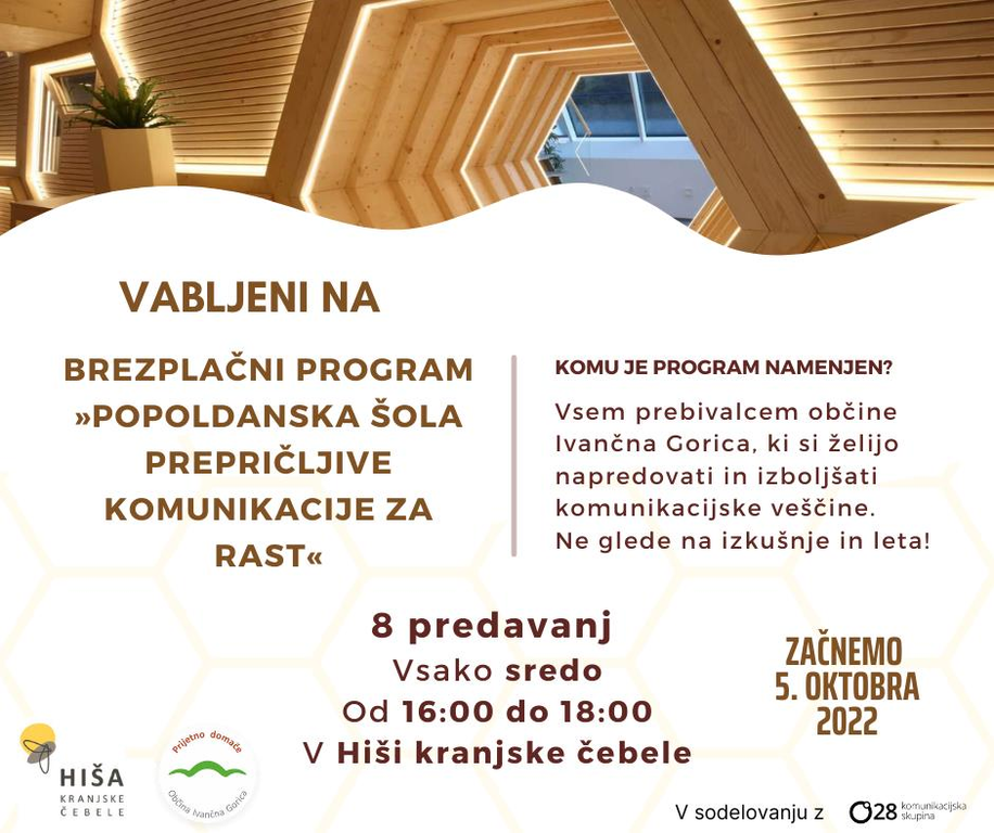 Prepričljiva komunikacija je eden najpomembnejših vidikov kariernega razvoja, uspeha podjetij, ekip in uspešnega delovanja v družbi. Zato sta Občina Ivančna Gorica in Središče inovativnih tehnologij APILAB – Hiša kranjske čebele združila moči in s strokovnjaki ustvarila brezplačni program »Popoldanska šola prepričljive komunikacije za rast«. Program je namenjen prebivalcem Občine Ivančna Gorica.