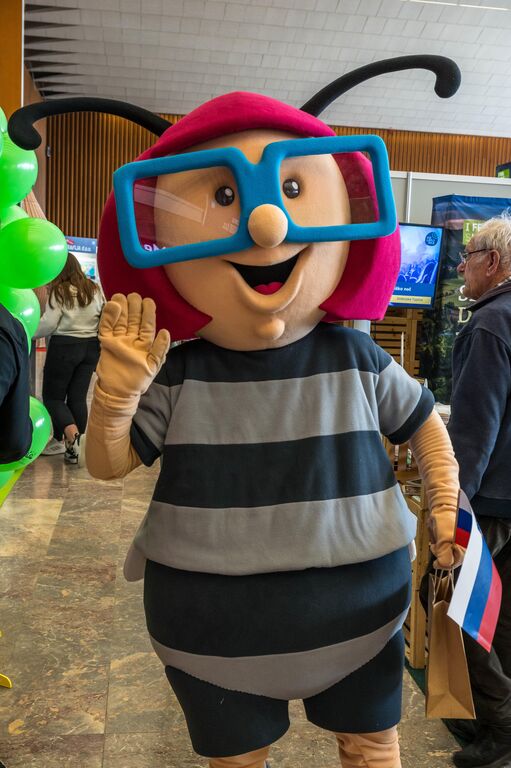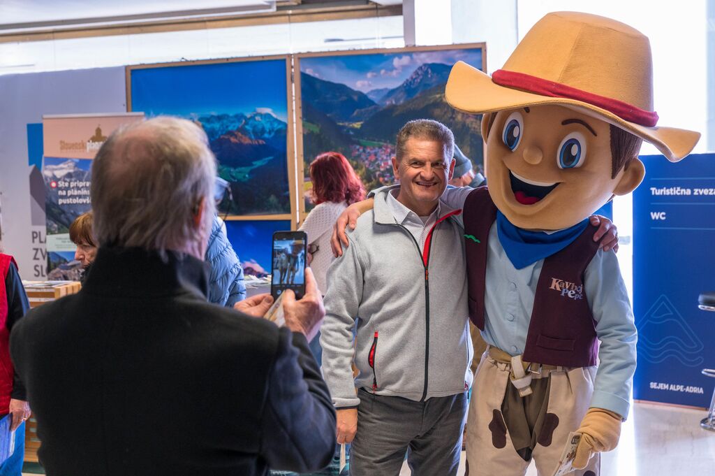Številne obiskovalce na sejmu pozdravljajo liki iz Jurčičevih del ter maskoti Višnja iz Hiše kranjske čebele in kavboj Pepe iz Kavbojske dežele.