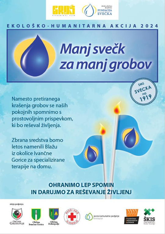 Člani Študentskega kluba GROŠ se tudi letos pridružujejo humanitarno ekološki akciji Manj svečk za manj grobov, katere namen je združevati ekološki namen zmanjševanja uporabe plastike za spomin na naše umrle s humanitarno pomočjo, ki rešuje življenja. Prostovoljci bodo na območju Občine Ivančna Gorica prisotni v četrtek, 31. 10., in v petek, 1. 11. 2024, na pokopališču v Šentvidu pri Stični.