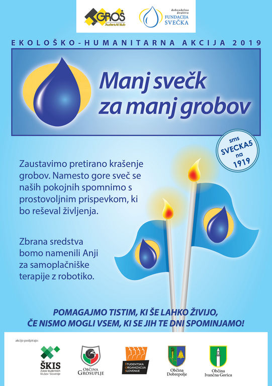 Akcija nosi tudi ekološko noto, saj namesto prižiga sveče na grob postavimo papirnato zastavico. Predstavniki ŠK Groš bodo zbirali prispevke in delili zastavice na glavnih vhodih pokopališč in sicer v četrtek, 31. 10. 2019 in v petek, 1. 11. 2019, od 8.30 do 16. ure, na pokopališčih Resje Grosuplje, Šmarje-Sap, Žalna in Šentvid pri Stični ter v četrtek, 31. 10. 2019, od 8.30 do 16. ure in v petek, 1. 11. 2019, od 13. do 16. ure na pokopališču Videm-Dobrepolje.