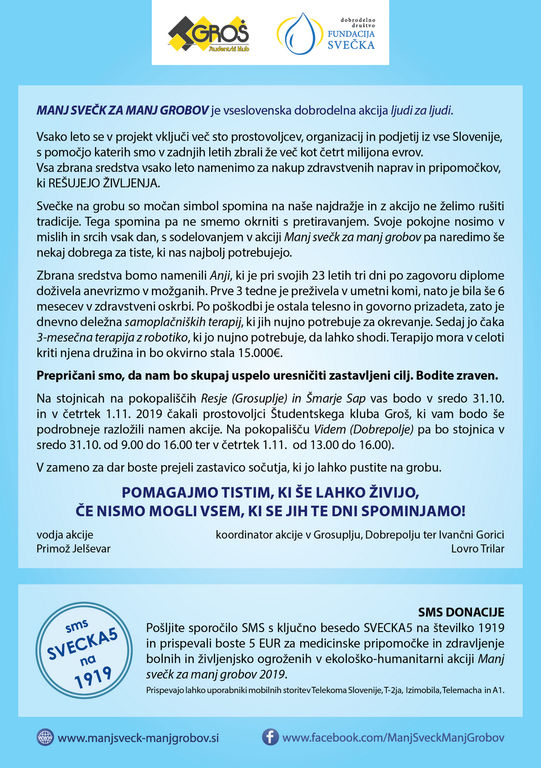 Tudi letos se v Študentskem klubu GROŠ pridružujejo dobrodelni akciji Manj svečk za manj grobov, kjer bodo zbirali sredstva za Anjo, ki je pri 23 letih doživela anevrizmo na možganih in za rehabilitacijo potrebuje drage terapije.