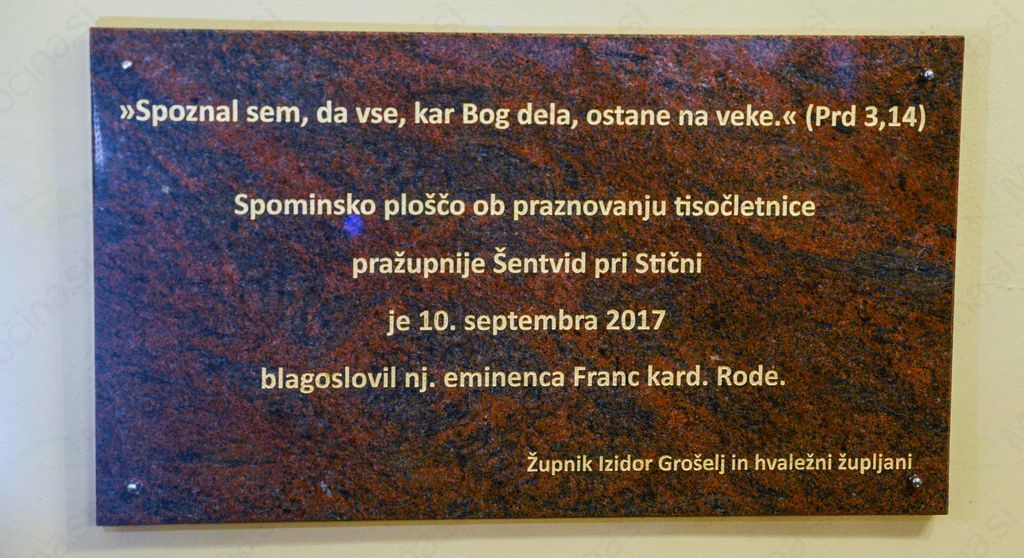 Včeraj je v Šentvidu pri Stični potekalo slovesno praznovanje 1000-letnice župnije. Praznično sveto mašo je daroval kardinal dr. Franc Rode, ki je v mašni pridigi poudaril pomen 1000-letne tradicije verskega življenja v Šentvidu pri Stični in na celotnem območju, ki ga je nekdaj obsežna pražupnija obsegala. Župnija je ob jubileju izdala tudi obsežno monografijo in pripravila priložnostno razstavo.