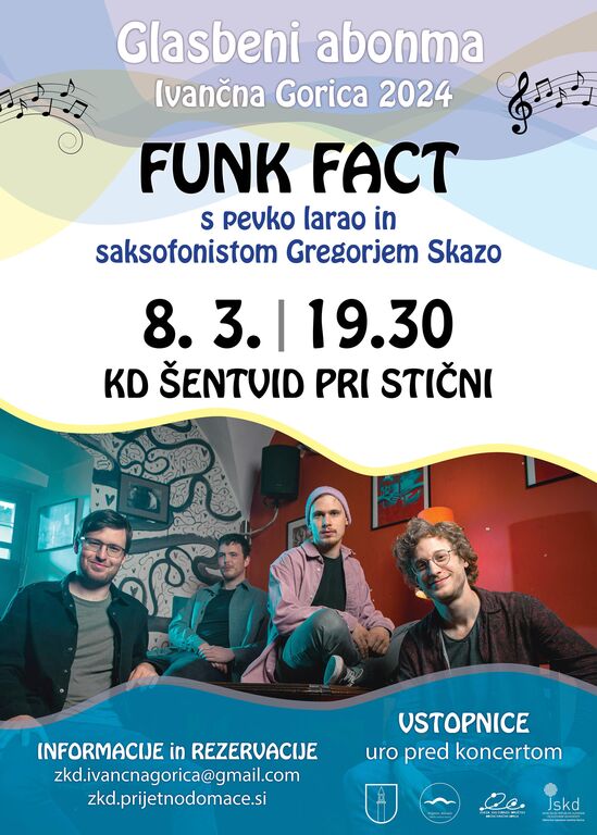 Funk Fact je zasedba štirih prijateljev, ki se poznajo že (pre)dolgo in so igrali v najrazličnejših zasedbah, zaradi česar se jim že malce meša. Kot rezultat tega kaosa je tik pred pandemijo nastal Funk Fact, v sklopu katerega so si ustvarili varno mesto za ustvarjanje funky avtorskih komadov s primesmi vsega možnega. Sodelovanje je na tej poti že postreglo s popevko tedna na Valu 202 in zagotovilo redno gostovanje Funka na radijskih frekvencah in lestvicah. V naše goste prihajajo v razširjeni zasedbi s pevko larao in saksofonistom Gregorjem Skazo.