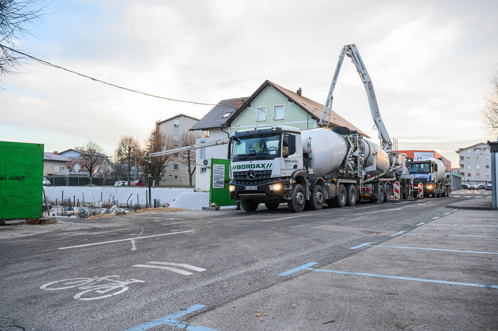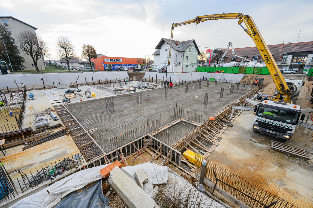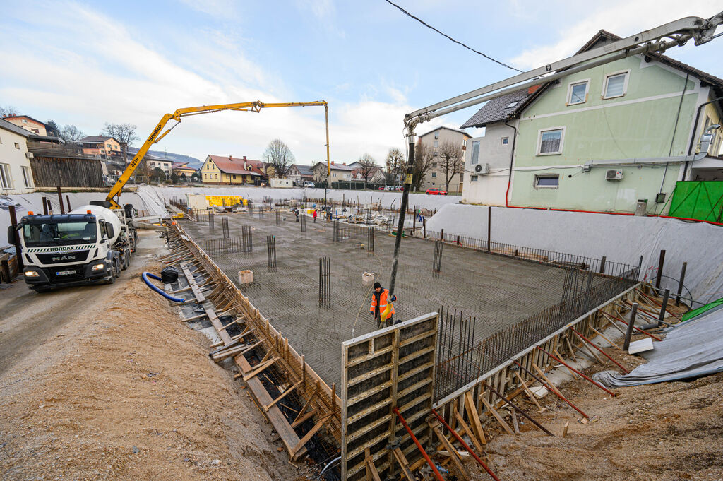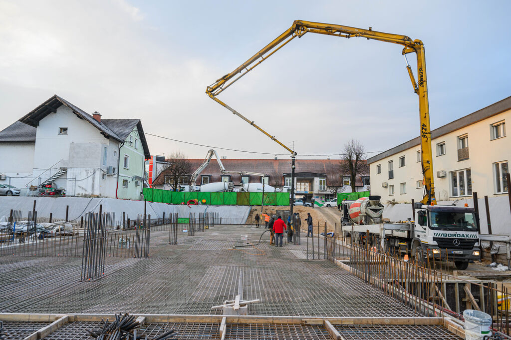 Zaradi specifično projektirane temeljne plošče betonaža le-te poteka v večih fazah. Do sedaj so bile izvedene tri faze betoniranja, ki skupno zajemajo površino okoli 2.200 m2, od celotne 2.400 m2. Dela se bodo nadaljevala tudi v decembru.