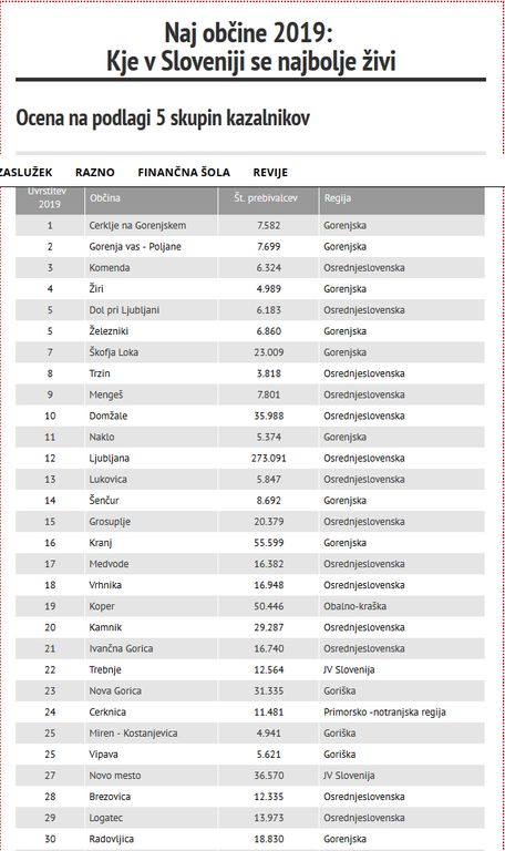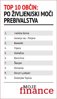 Časnik revije Moje finance je že četrto leto zapored objavil raziskavo o kakovosti življenja v 212 občinah v Sloveniji. Kje ljudje zaslužijo nadpovprečne plače, kje je nizka stopnja brezposelnosti, dostopna stanovanja, kje imajo dobro urejeno infrastrukturo, kje najbolj zdrave občane? Na podlagi petih glavnih kazalcih gospodarstvo, prebivalstvo, infrastruktura, zdravje in kriminaliteta ter številnih podkazalnikih so statistično izračunali, kakšno je življenje v posamezni občini.