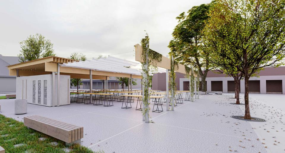 Izgradnja tržnice zajema tudi ureditev tlakovanega odprtega prostora oziroma trga in zelenega pasu ob Cesti 2. grupe odredov in železnici ter postavitev urbane opreme.