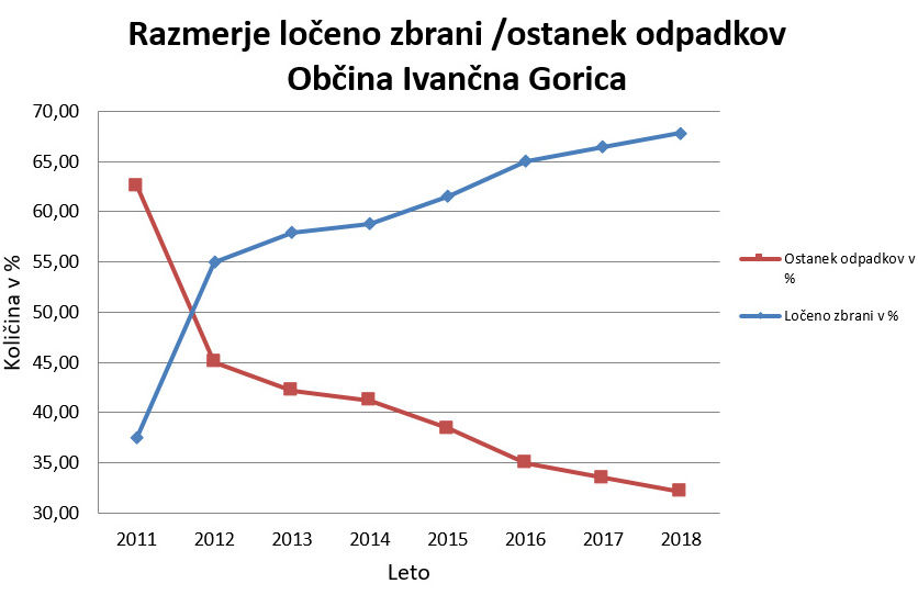 V letu 2018 smo na območju občine Ivančna Gorica zbrali skupaj 4.353 ton komunalnih odpadkov, od tega 2.955 ton ločenih frakcij ter 1.398 ton mešanih komunalnih odpadkov (črni zabojnik). S tem smo izboljšali rezultat zbrane količine ločenih frakcij iz leta 2017 za 1,41%. Skupaj smo tako zbrali že 67,89% ločenih frakcij, kar je razvidno na spodnjem grafu.