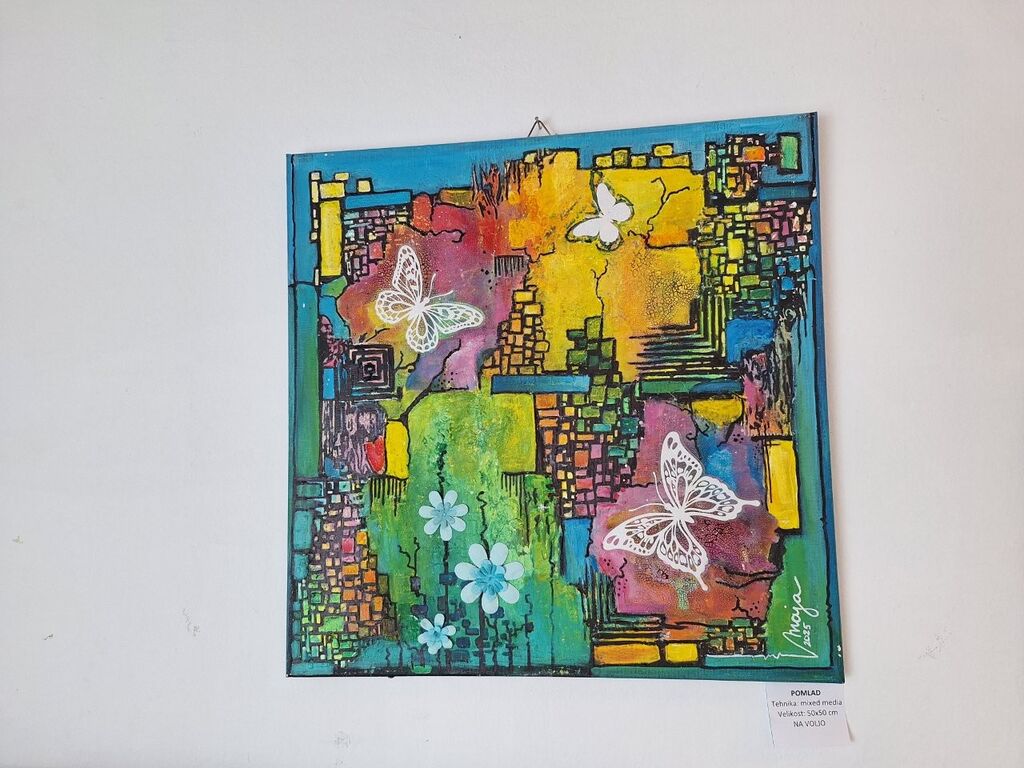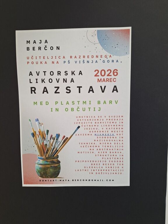 Maja Berčon, učiteljica razrednega pouka na Podružnični šoli Višnja Gora, se v Knjižnici Ivančna Gorica predstavlja z avtorsko razstavo Med plastmi barv in občutij. Kar 22 likovnih del, ki v prostore prinašajo razigrano pomladansko vzdušje, si lahko ogledate v pritličju in nadstropju knjižnice vse do konca marca 2026.