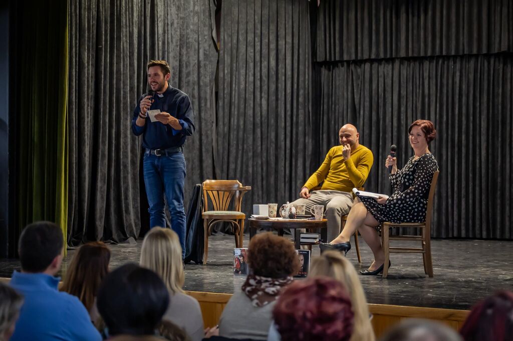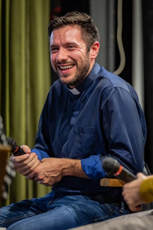 Župnik Golob, ki je s svojim vstopom na socialna omrežja leta 2018 začel nagovarjati množice in postal eden najbolj znanih ter vplivnih duhovnikov v državi, je v Stični predstavil svoje otroštvo, poslanstvo in veselje, ko ljudem lahko prinaša upanje, z Grčmanom pa smo prehodili pot od mladega športnega navdušenca na stiškem igrišču do športnega novinarja, moderatorja, komentatorja, voditelja, ki je zadnja leta zaposlen kot novinar in urednik socialnih omrežij na portalu Aleteia. Ker ima šport, še posebej rokomet, v njegovem življenju pomembno vlogo, je letos s še nekaterimi somišljeniki začel ustvarjati rokometni podkast Roling.