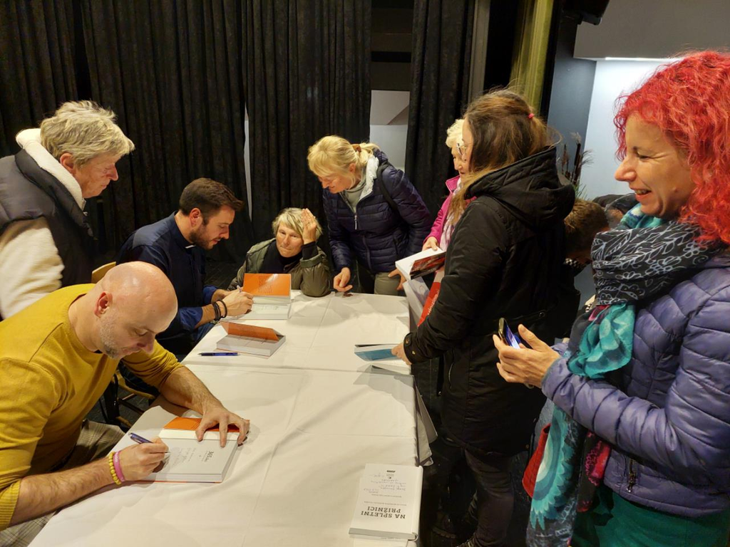 Četrtkov večer, 14. novembra 2024, ki bi lahko bil novembrsko turoben, se je spremenil v izjemno doživetje, ki ga verjetno še dolgo ne bodo pozabili vsi, ki so se odzvali povabilu Knjižnice Ivančna Gorica ter Turističnega društva Stična in prišli v stiški kulturni dom na pogovorni večer ob čaju. Župnik Martin Golob in domačin, najbolj znan kot novinar in pisatelj, Lojze Grčman sta na svojstven, z velikim žarom in humorjem prepleten način, govorila o svojem delu in življenju, pa seveda o knjigah, ki sta jih doslej ustvarila. Na spletni prižnici, ki je njun prvi skupni projekt, v katerem je Grčman ubesedil Golobove misli in spodbude, je izšla pred dvema letoma. Ta knjiga je svojevrsten fenomen v Sloveniji, pri založbi Družina so v teh dneh namreč objavili, da je bilo doslej prodanih že več kot 25.500 izvodov, kar v časih, ko knjige izhajajo v nakladi nekaj sto izvodov, veliko pove.