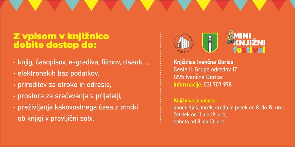 Knjižnica Ivančna Gorica v torek, 19.aprila, vabi pred knjižnico, kjer se bo odvijal Mini knjižni festival. V knjižnici bo veselo že dopoldne, ko nas bodo obiskale šolske skupine, popoldne (med 15.30 in 19. uro) pa se obeta glasbeni in animacijski program, otroke bo obiskal Nerodni Avguštin, lahko si boste ogledali kamišibaj, odprli bomo razstavo likovnih del, ki so nastala v Mali šoli umetnosti z Damijano Bijek, poleg tega boste lahko kupili naše knjige. Izkoristite priložnost in se tega dne tudi brezplačno vpišite v knjižnico. V primeru slabega vremena bomo na terasi za knjižnico. Dogodek je posvečen Slovenskemu tednu knjig, ki poteka v tednu pred 23. aprilom, ko praznujemo Svetovni dan knjige.