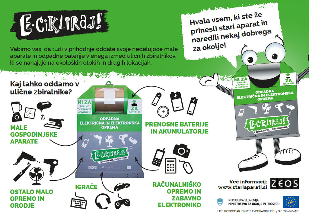 Širom države jih je postavljenih že 670, večinoma stojijo na večjih ekoloških otokih. Še posebej mali aparati in baterije se zaradi svoje majhnosti velikokrat znajdejo med mešanimi odpadki, ulični zbiralniki pa marsikaterega izmed njih uspešno prestrežejo in poskrbijo za pravilno obdelavo. Postavljeni so v organizaciji družbe ZEOS, d.o.o. v sklopu projekta Life Gospodarjenje z e-odpadki pod sloganom E-cikliraj, ki je sofinanciran s strani Evropske komisije in Ministrstva za okolje in prostor RS. V Sloveniji smo v sklopu te mreže zbrali že dobrih 976 ton tovrstnih odpadkov. Njihove lokacije lahko najdete na spletnem zemljevidu na www.stariaparati.si.