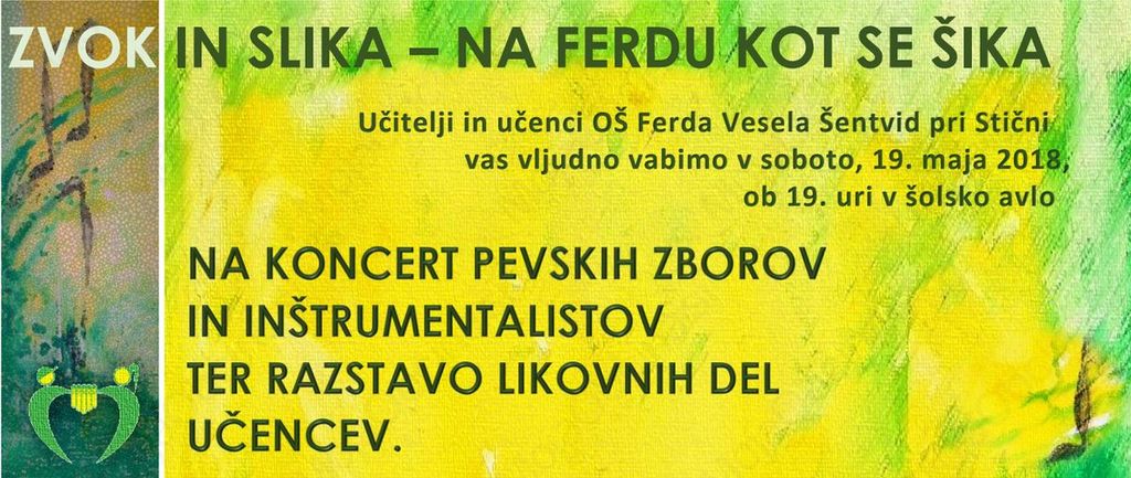 Danes ob 19. uri lahko v Osnovni šoli Šentvid pri Stični prisluhnete koncertu pevskih zborov in inštrumentalistov ter ogledate razstavo likovnih del učencev na kulturni prireditvi Zvok in slika – Na Ferdu kot se šika.