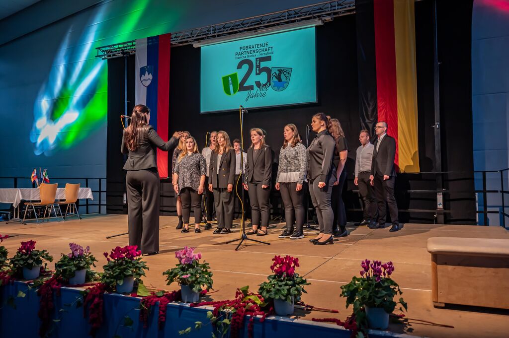 Osrednje praznovanje jubileja je potekalo v soboto, 28. septembra, v Regnitzareni, kjer sta župana obeh občin, Dušan Strnad in Klaus Homann, s slavnostnim podpisom listine obnovila določila o pobratenju. V svojih nagovorih sta izpostavila pomen pobratenja, ki temelji na iskrenem prijateljstvu med ljudmi dveh različnih narodov, ki sta si po navadah, kulturi, veroizpovedi in ciljih zelo podobna. Po besedah župana Strnada se je v petindvajsetih letih pobratenja zgodilo veliko dobrega in pomembnega, kar je utrdilo vezi med občinama, zlasti na področjih vere, gasilstva, kulture, gospodarstva in šolstva. Velike priložnosti pa se ponujajo tudi na področju turizma, saj imata občini veliko za pokazati in ponuditi. Zbrane sta nagovorila tudi častna občanka Hirschaida in nekdanja podžupanja Romana Gensel ter poslanec nemškega zveznega parlamenta Thomas Silberhorn.