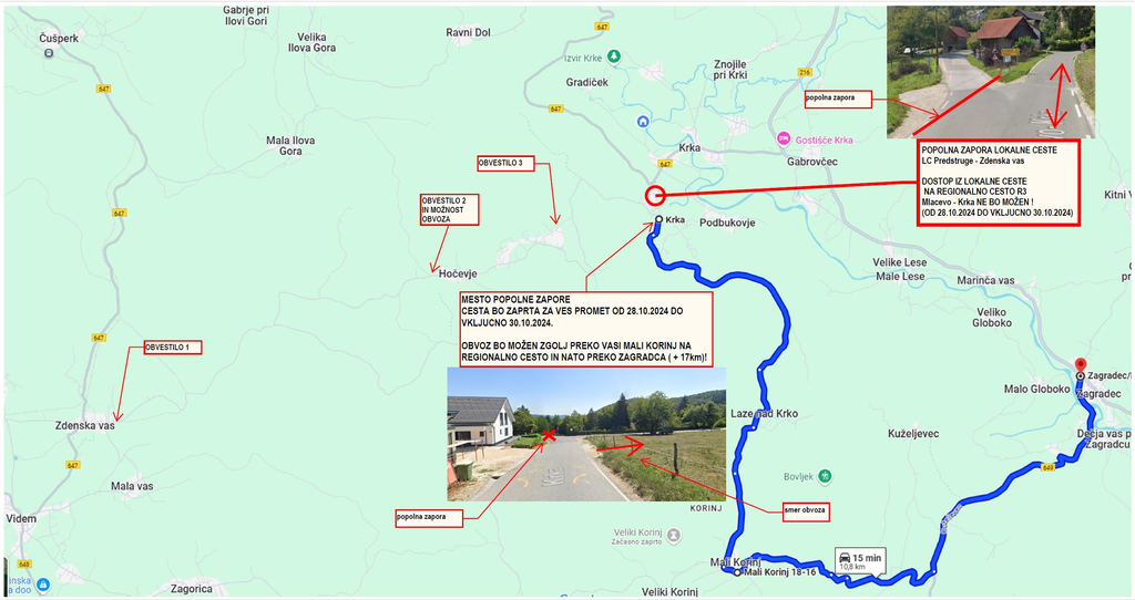 Obvoz bo možen le skozi naselje Mali Korinj na regionalno cesto R3 (Zagradec – Ambrus – Žvirče) in nato naprej proti regionalni cesti R1 (Krka – Žužemberk), ki poteka skozi naselje Zagradec. Obvoz vožnjo podaljša za približno 17 km oz. cca. 25 min dodatne vožnje.