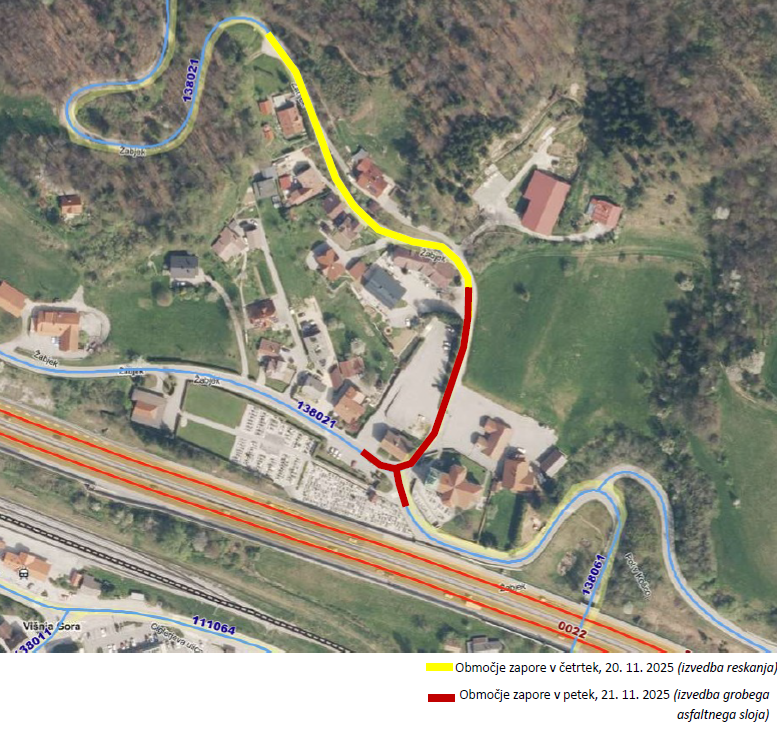 Obveščamo vas, da bo popolna zapora, ki je bila predvidena zaradi izvedbe grobega asfaltnega sloja na križišču Žabjek v Višnji Gori, za danes, v petek, 21. 11. 2025, prestavljena na ponedeljek, 24. 11. 2025. Popolna zapora bo trajala od 7. do predvidoma 16 ure.. Popolna zapora bo potekala od vključno križišča pri cerkvi sv. Tilna do Doma starejših Višnja Gora (do hišne številke 13).