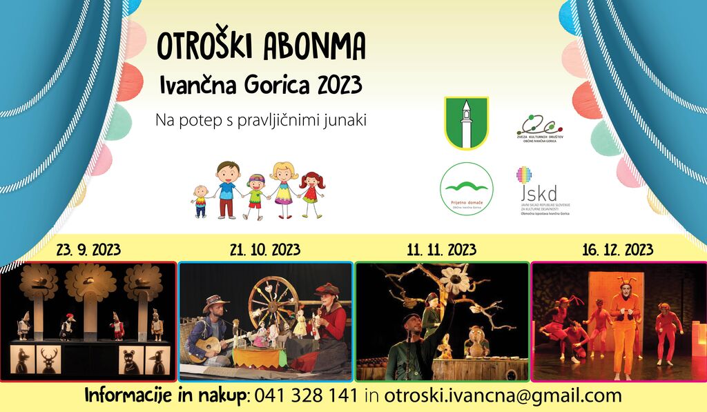Jesen je čas, ko se ponovno odpirajo vrata čarobnega sveta kulture in gledališča. Z veseljem vam predstavljamo že peto sezono Otroškega abonmaja Ivančna Gorica. Organizatorji smo pripravili niz štirih čarobnih predstav, ki se bodo odvijale od septembra do decembra in razveseljevale najmlajše od četrtega leta dalje v spremstvu staršev, babic, dedkov, tet in stricev … Sobotni dopoldnevi so tisti, ko se lahko sproščeno posvetimo obisku slikovitih predstav v lokalnem okolju. Vse je na dosegu roke, posvečen čas pa čudovito bogati otroško domišljijo, naše pogovore, krepi naše vrline in vodi v ustvarjalno odraslost.